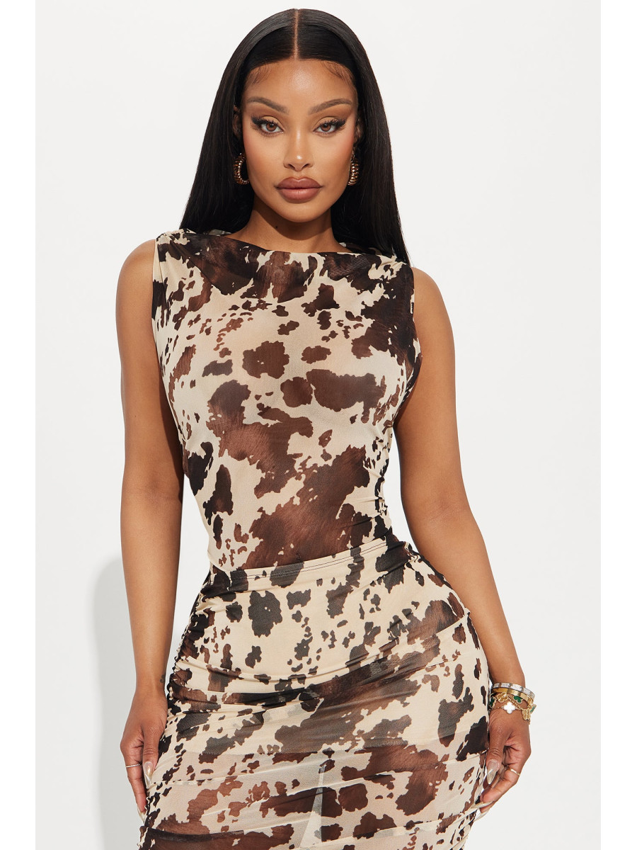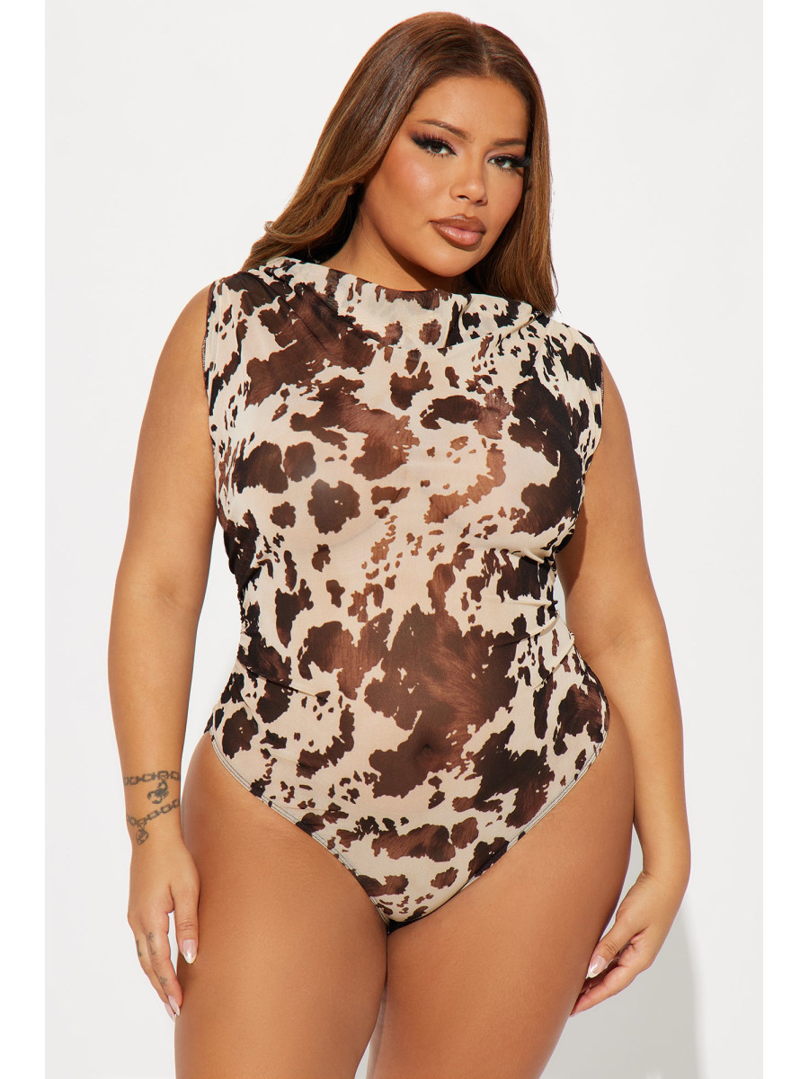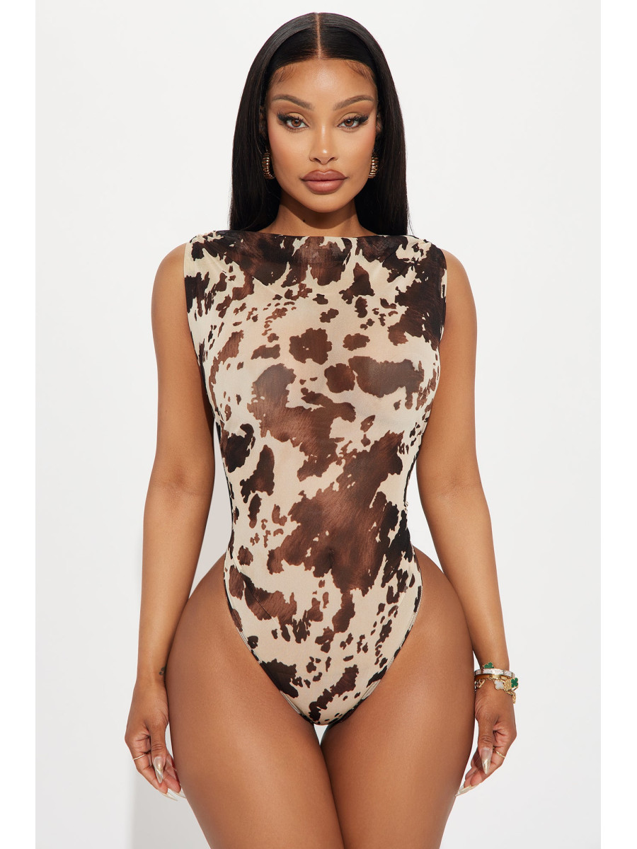 Ефектне боді з сітки з човним вирізом та без рукавів, прикрашене вишуканим анімалістичним принтом. Пікантний виріз знизу та драпірування створюють спокусливий образ. Застібка-кнопка знизу забезпечує зручність, а еластична тканина — ідеальну посадку. Це боді додасть вашому вбранню нотку екстравагантності та стилю.