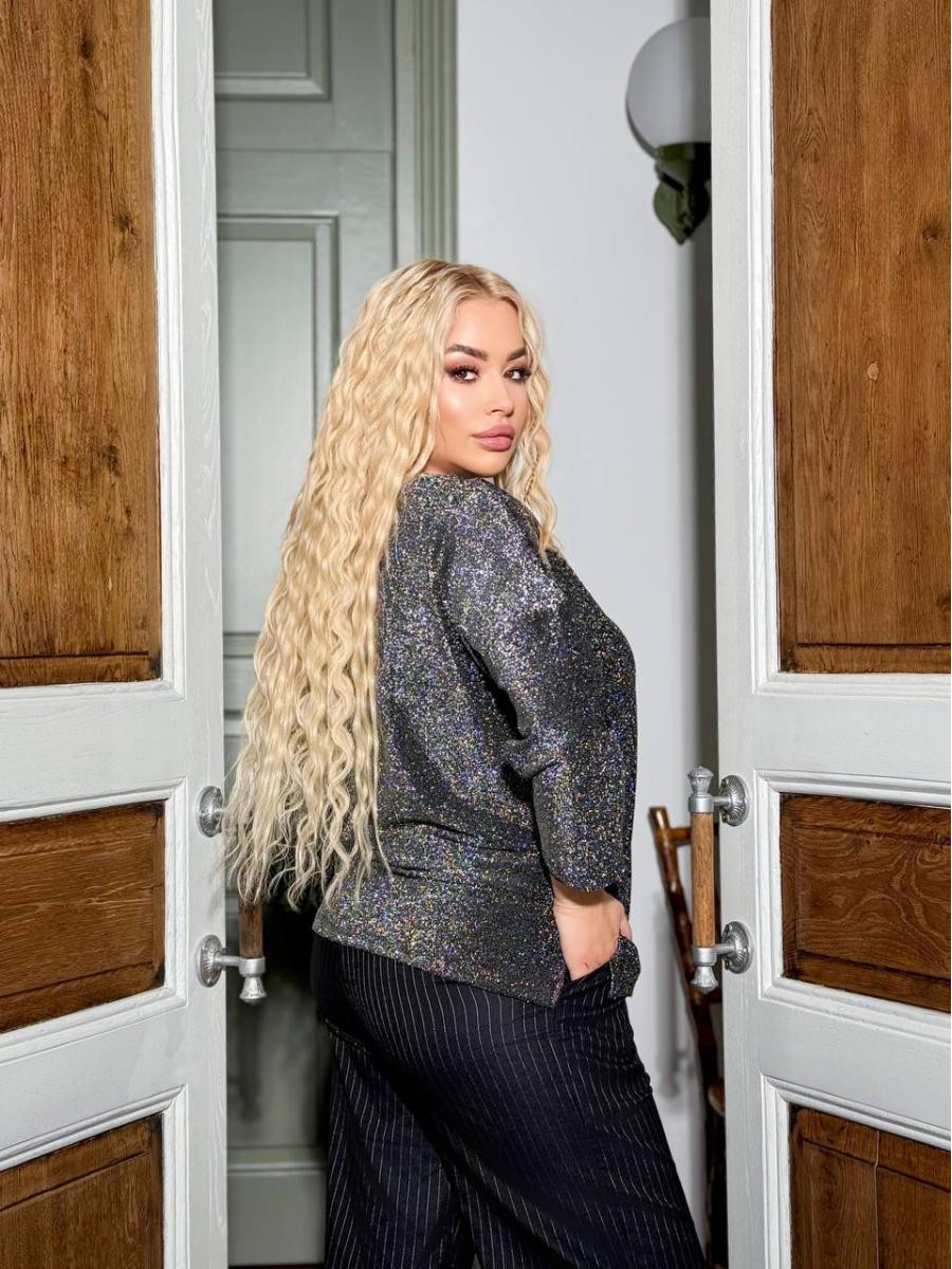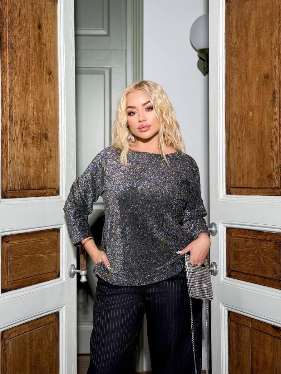 МОДЕЛЬ ‼️ Базовий люрексовий лонгслів з вільного крою довжиною рукава 7/8 приспущений плечовий шов . Горловина човником. Розрізи по боках. ▪️РОЗМІРИ ПОДВІЙНІ 1)46-48 2)50-52 3)54-56