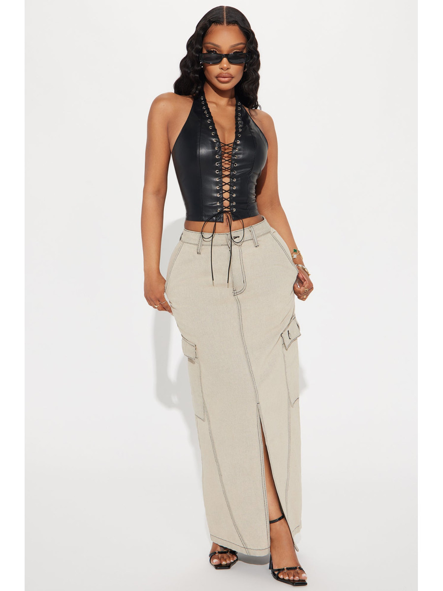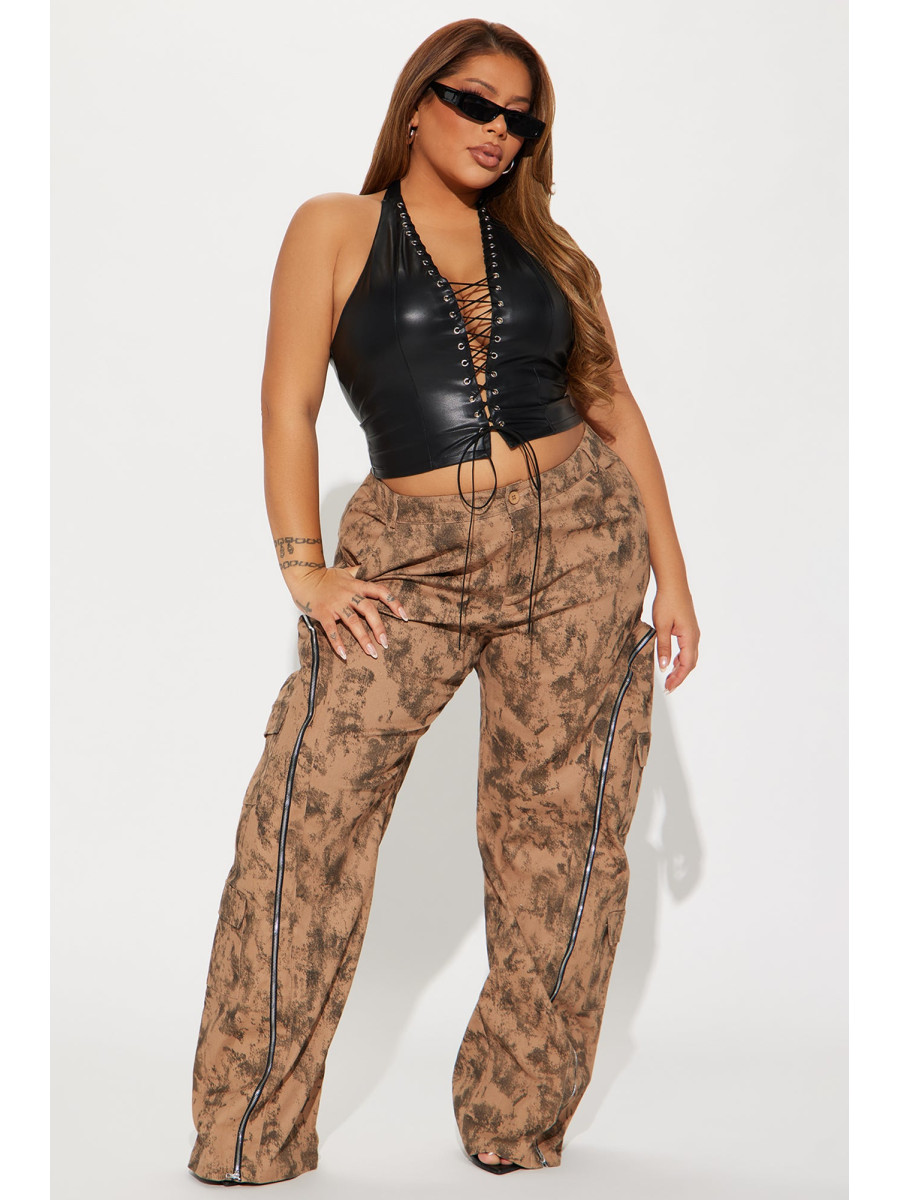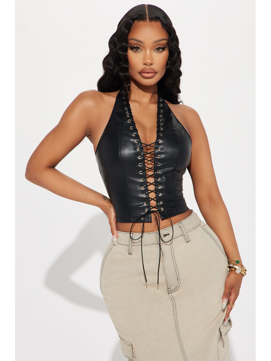 Ефектний топ без рукавів з елементами шнурівки, що додає образу пікантності. Виготовлений зі штучної шкіри, цей топ має виразну металеву фурнітуру та комфортну еластичну текстуру. Ідеально підходить для сміливих та трендових образів. Матеріал: 100% поліестер (покриття: 100% поліуретан).
