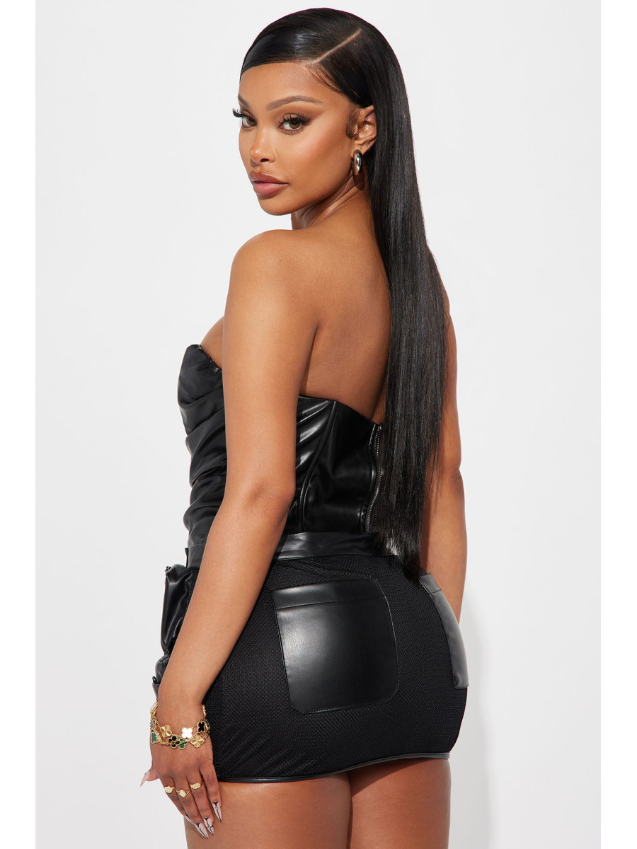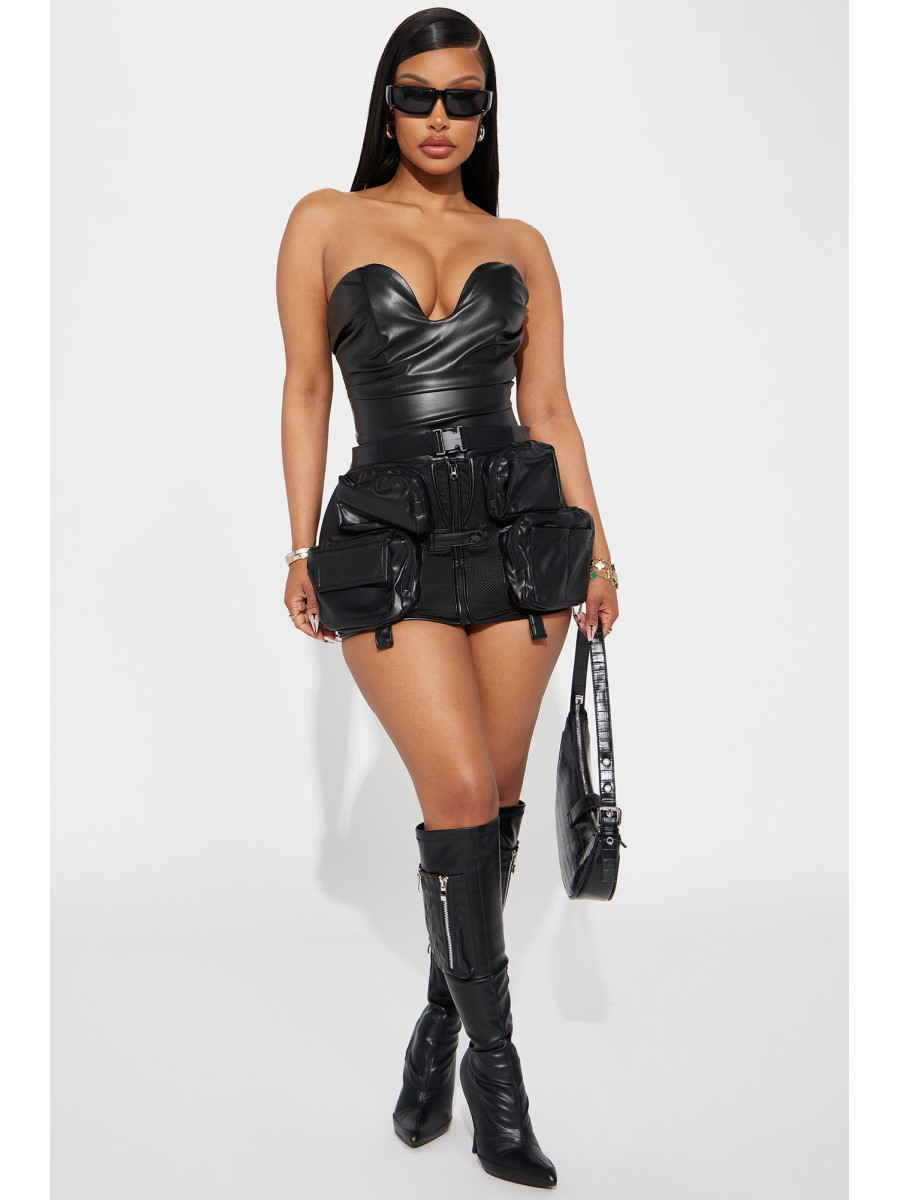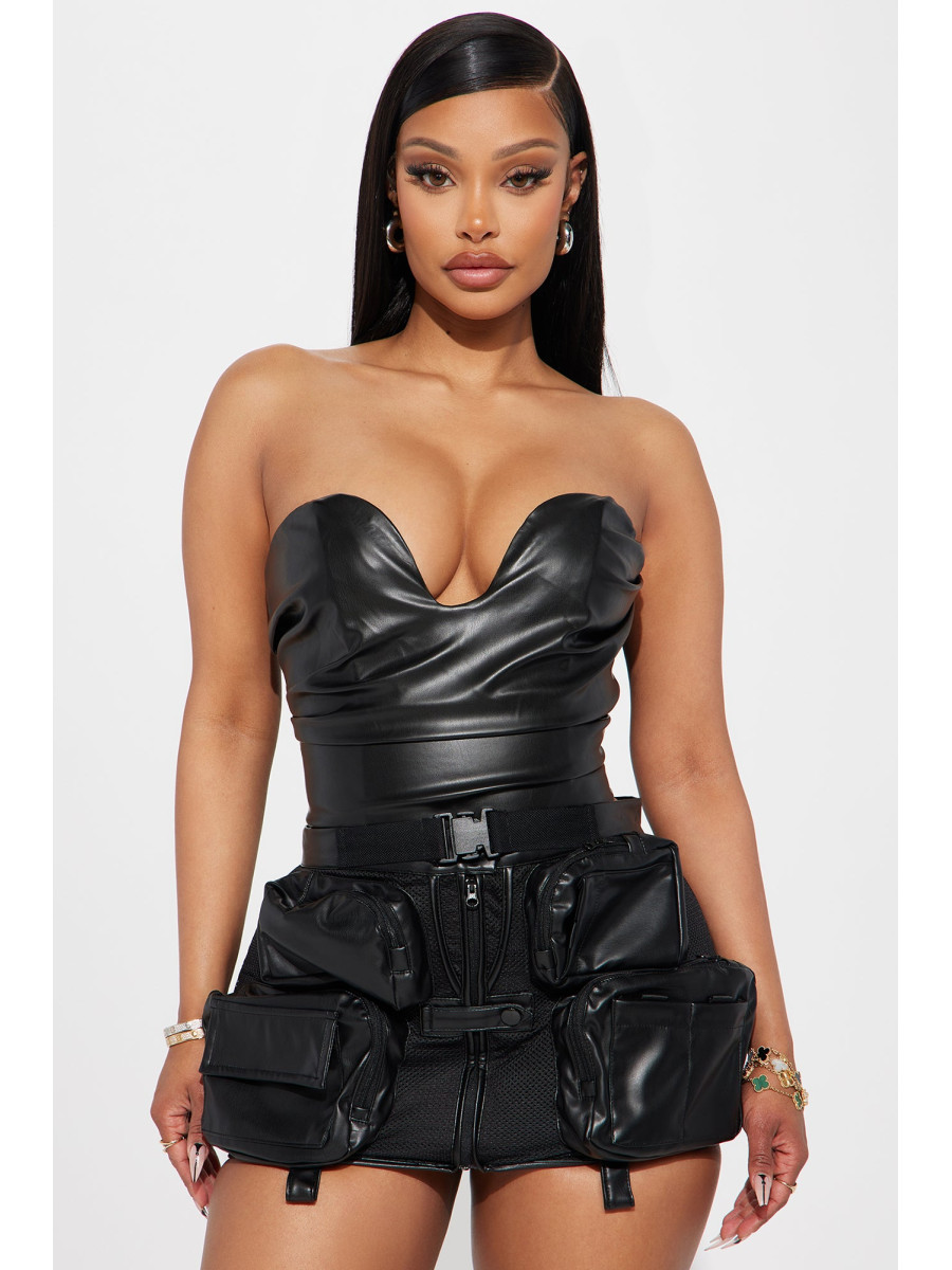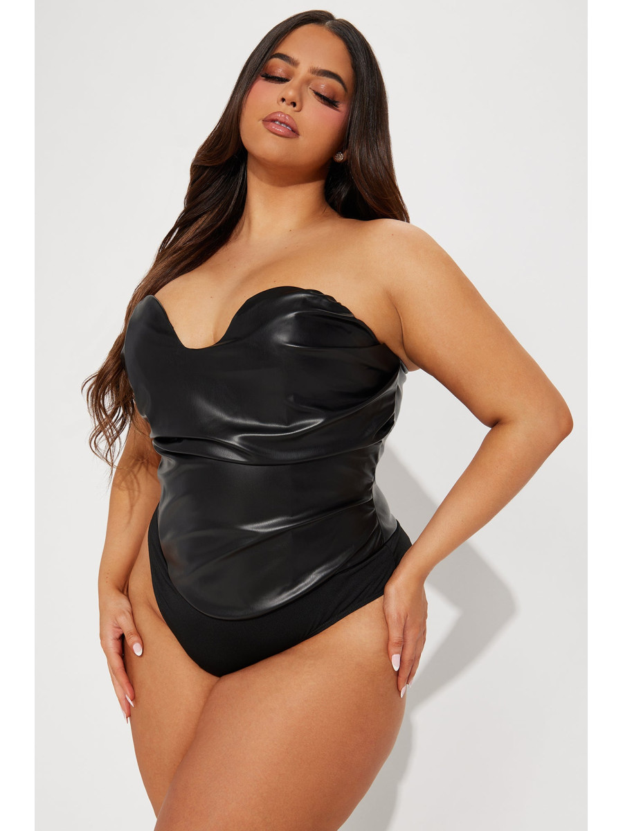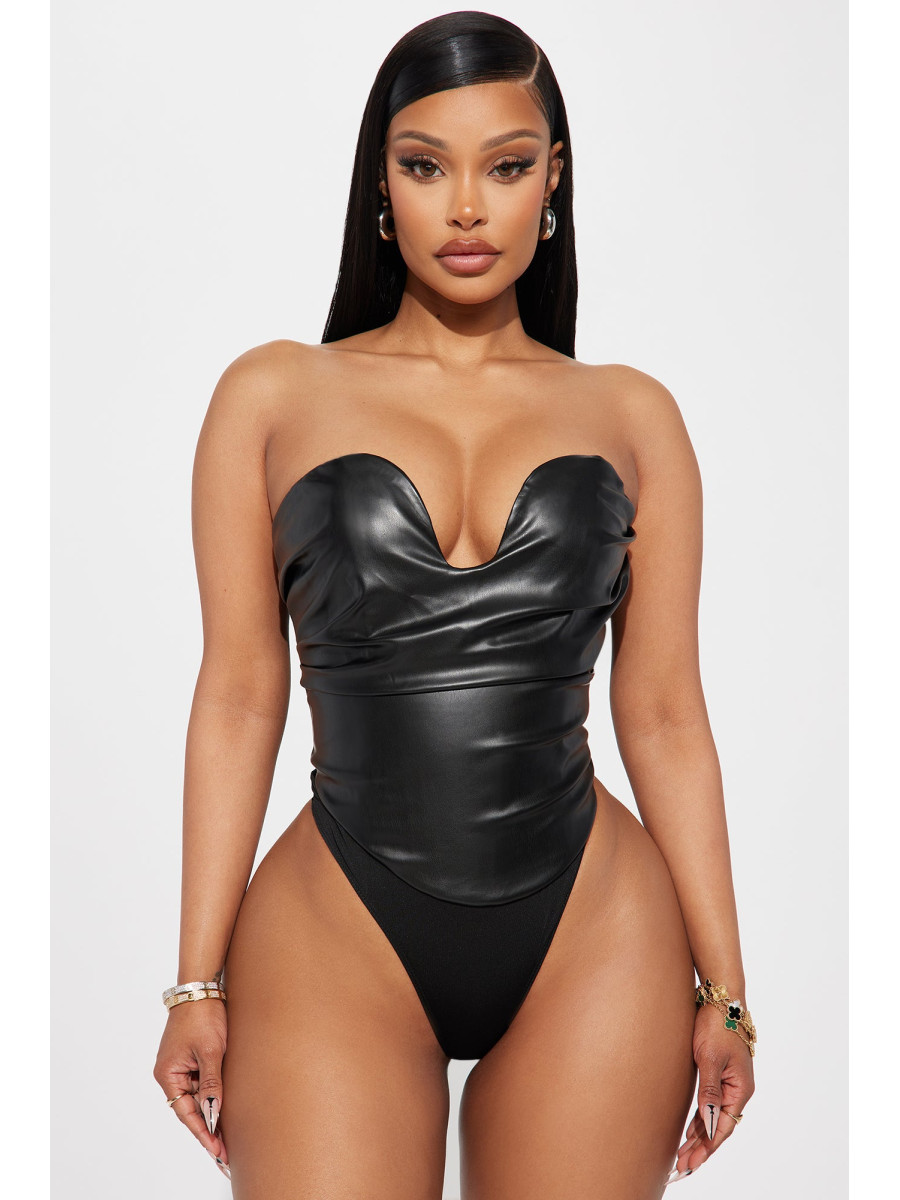 Розкішне боді без рукавів, що підкреслить вашу фігуру. Елегантний дизайн доповнений щільною стрічкою та кісточками для ідеальної посадки. Делікатні драпірування та пікантний виріз ззаду створюють спокусливий образ. Зручна застібка-блискавка ззаду та кнопки знизу забезпечують легкість у використанні. Виготовлене з ефектної штучної шкіри, це боді додасть вашому вбранню нотку зухвалості. Матеріал забезпечує чудову еластичність та комфорт.