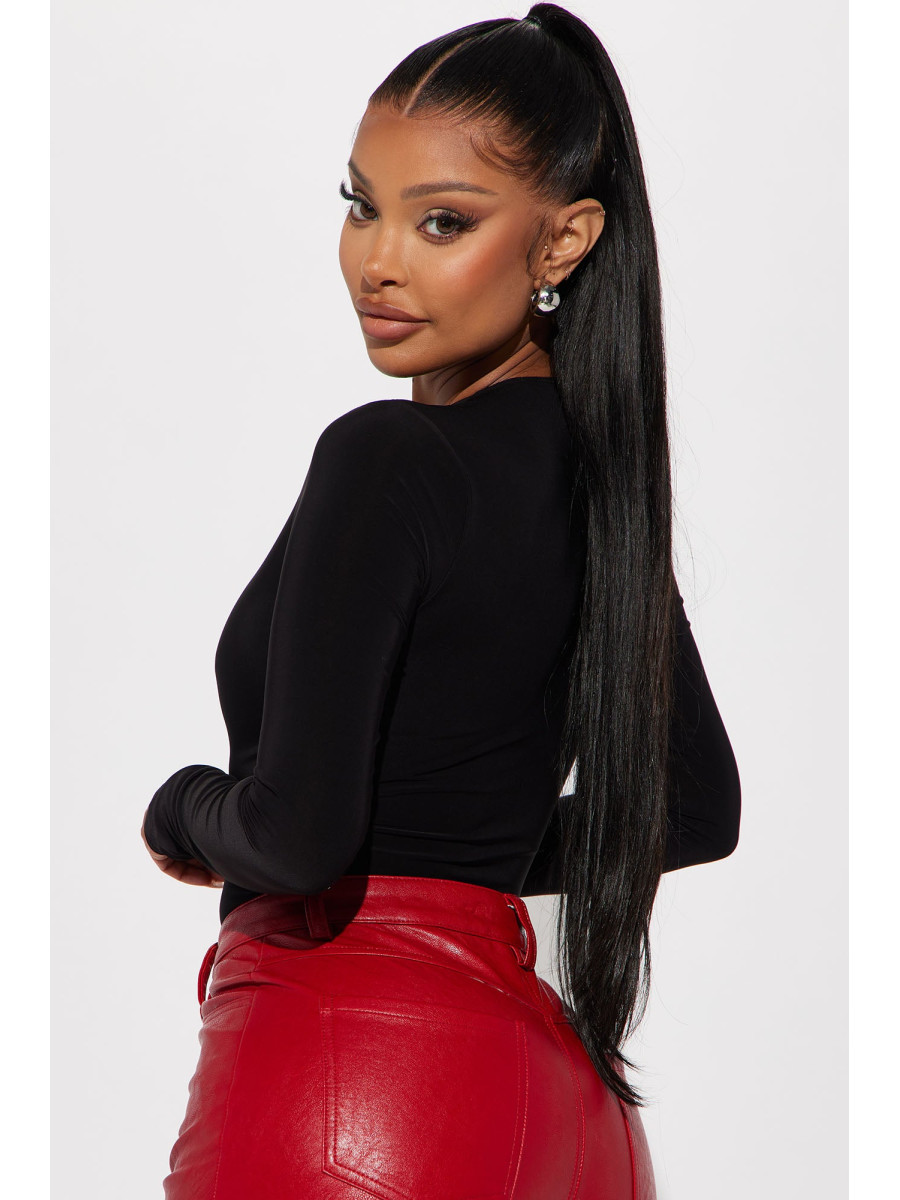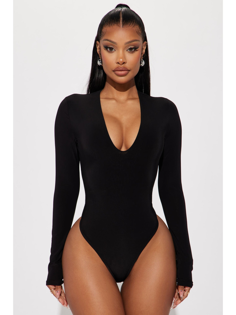Елегантне боді з довгими рукавами та спокусливим глибоким V-подібним вирізом. Дизайн створює витончений силует, а застібка на кнопках внизу та стрінг-крій забезпечують комфорт і бездоганний вигляд під будь-яким одягом. Матеріал: 95% поліестер, 5% спандекс. Додатковий комфорт завдяки підкладці.