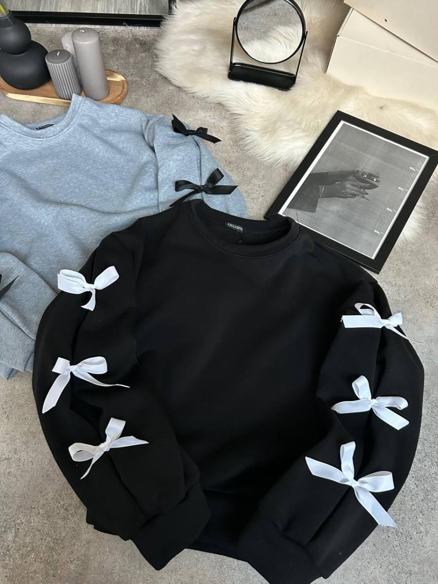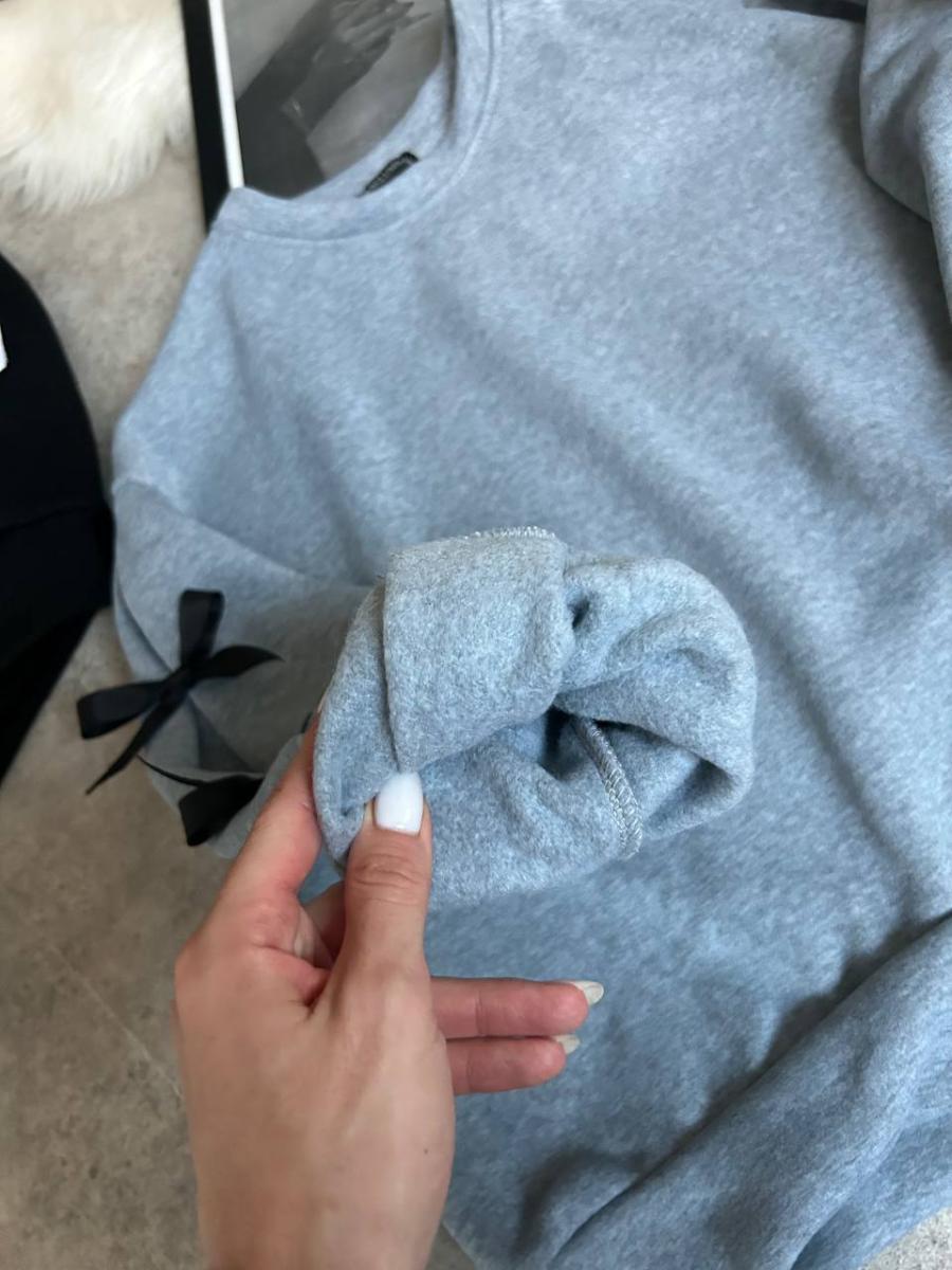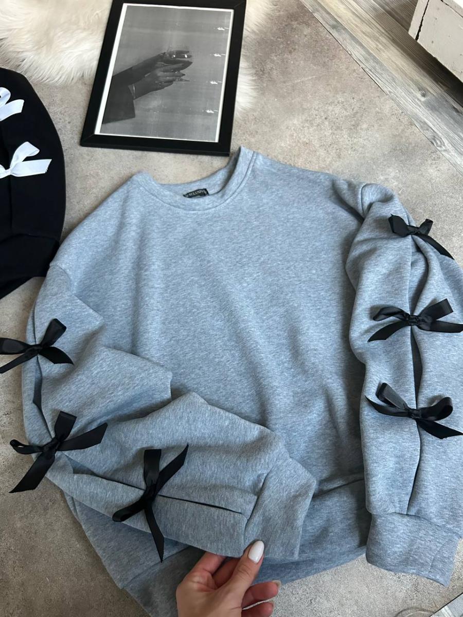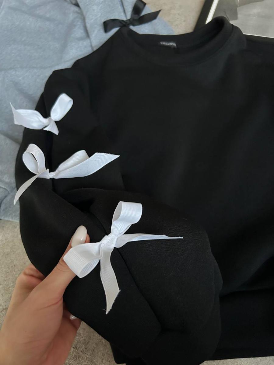 Батник Код Тканина: Трьохнить на флісі Розмір: 42-46 універсал Кольори: чорний, сірий Wow Трендовий батник з бантиками на рукавах. Тепленький на флісі. В вільному оверсайз стилі.